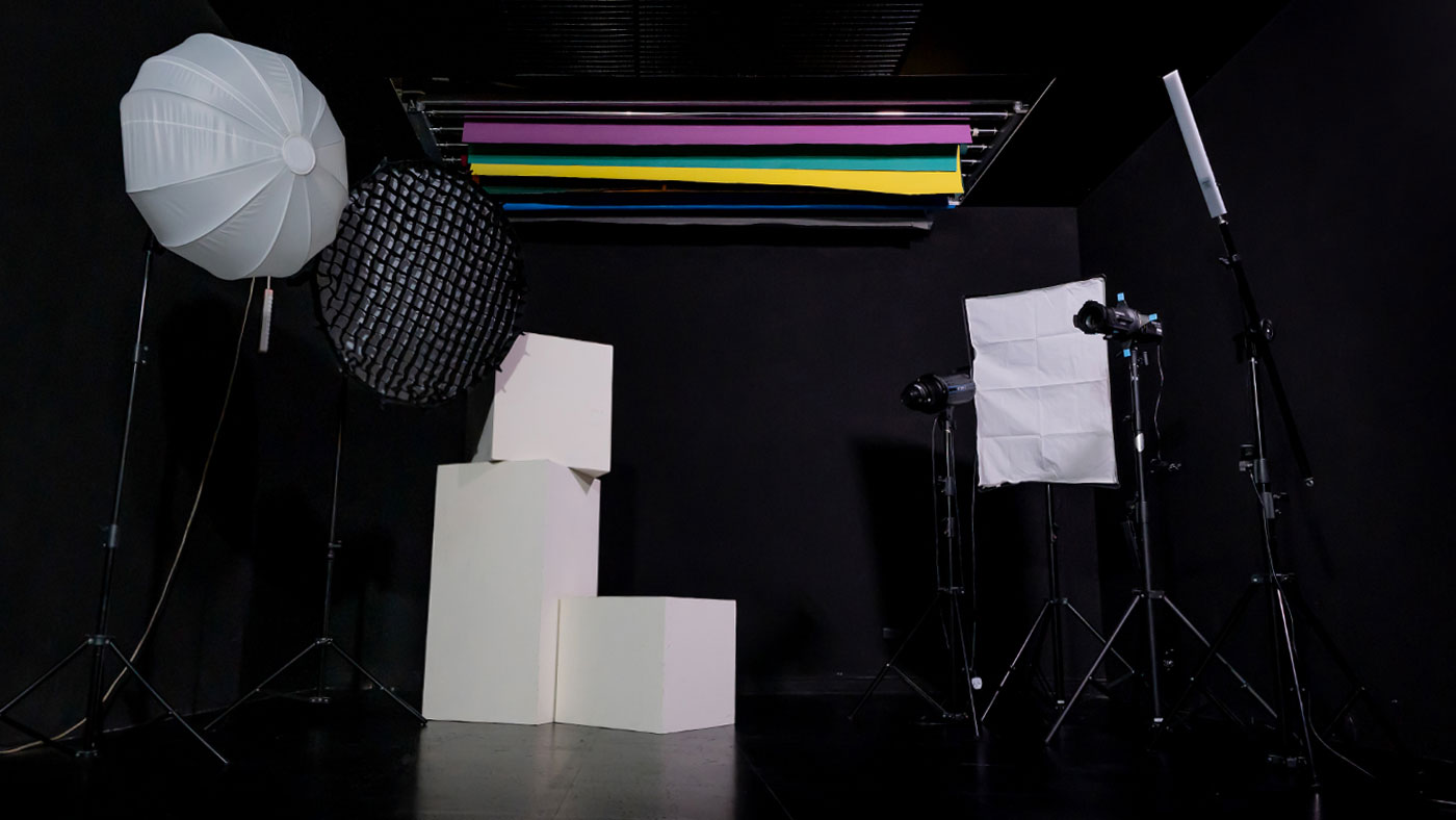 A square-layout pure black photography studio, also equipped with a variety of colored backdrop papers to support diverse creative projects.