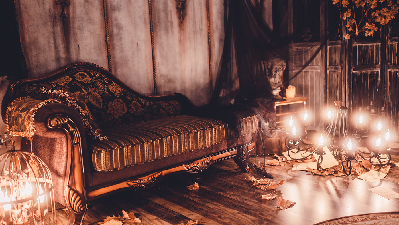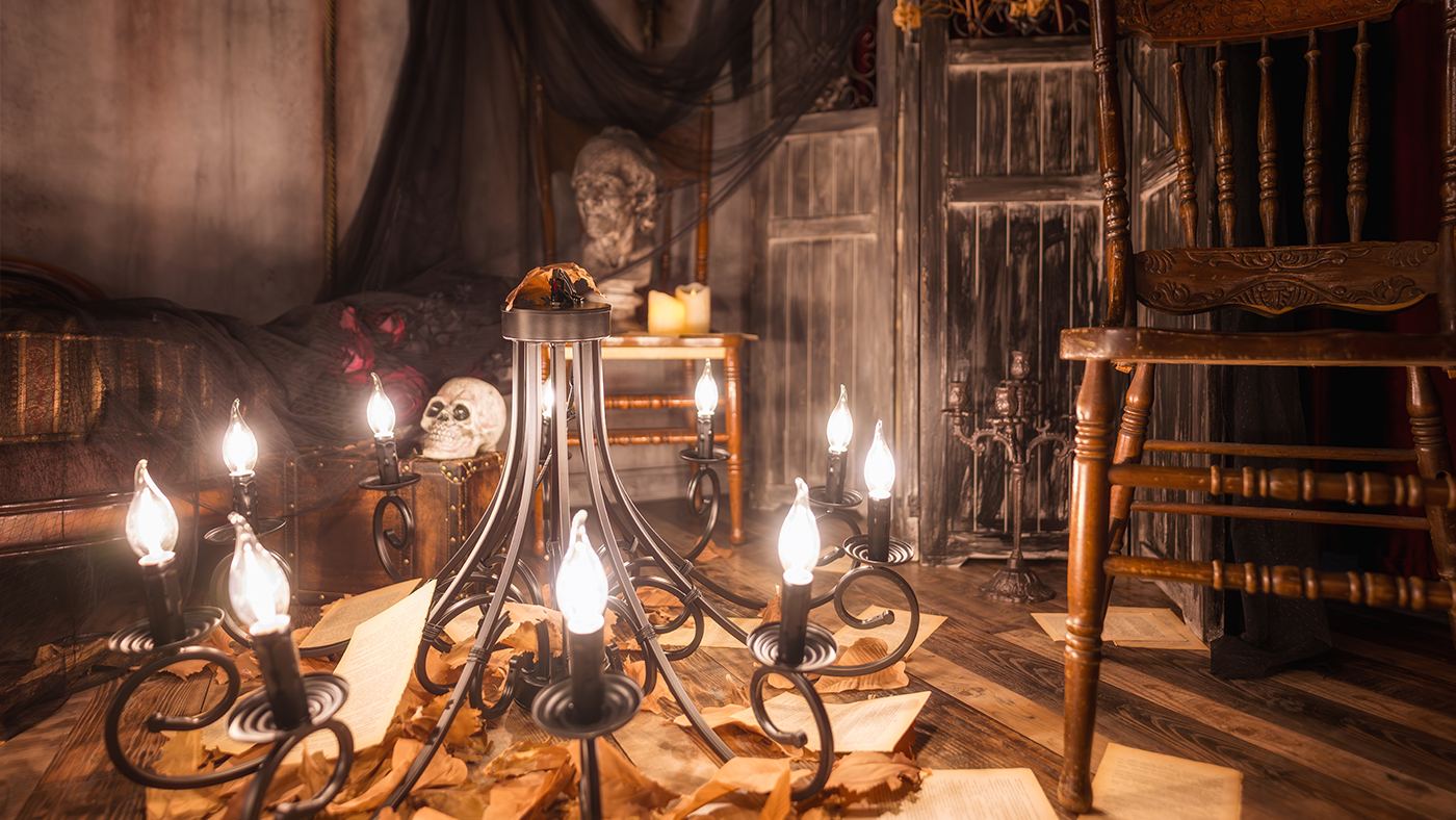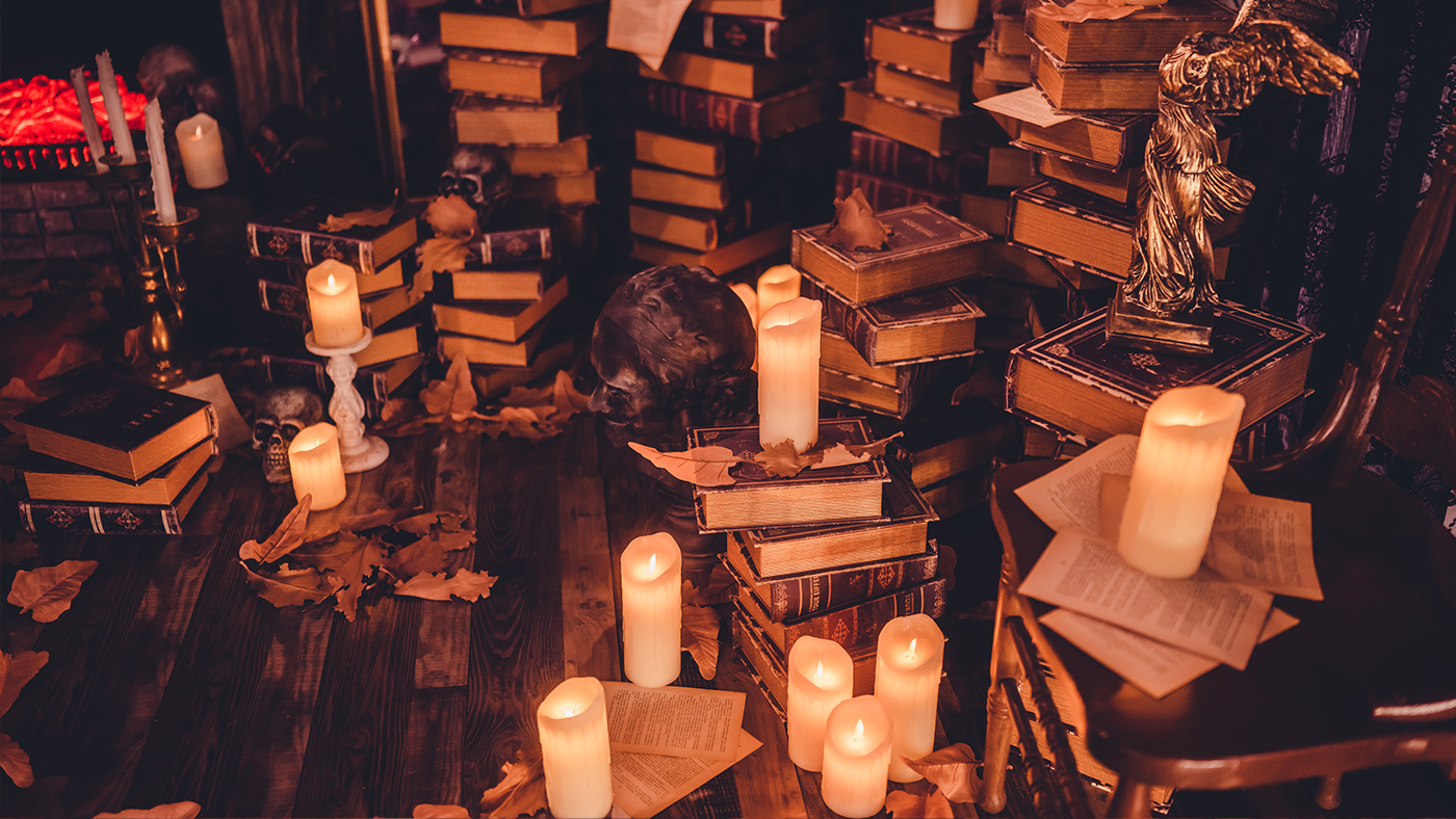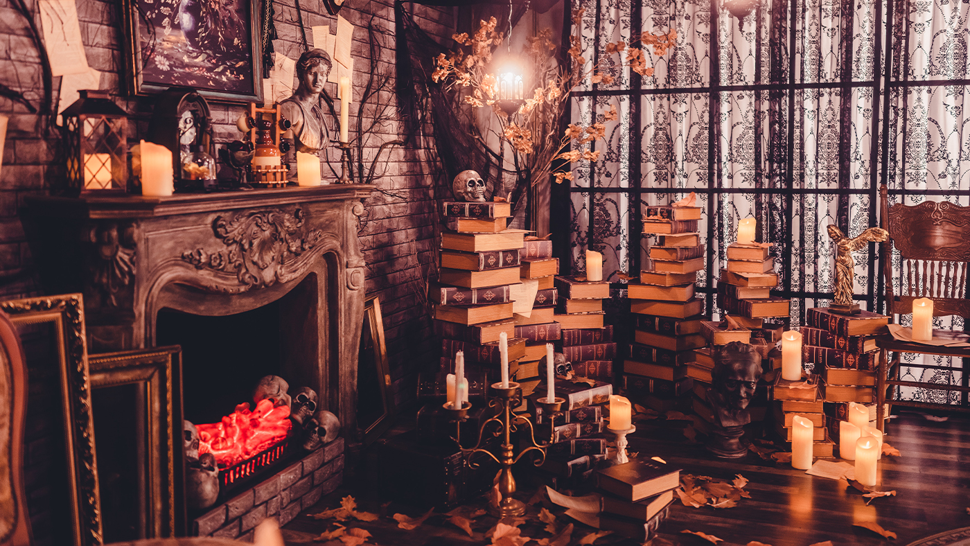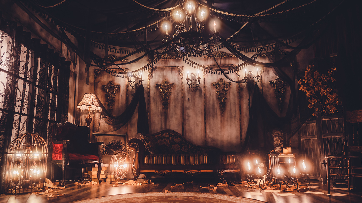 An old European mansion with a rich history, featuring a dark, witchy atmosphere and a sense of age. In one corner of the room, a large black cauldron is emitting mysterious smoke, as if whispering ancient spells… On the nearby workbench, bottles and jars glow with strange light, waiting for the next mysterious experiment…